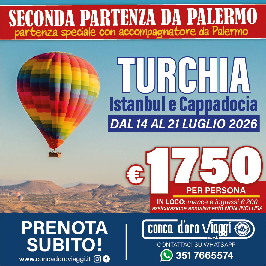 TURCHIA E CAPPADOCIA LUGLIO 2026 DAL 14 AL 21 LUGLIO 2026 PARTENZA SPECIALE CON ACCOMPAGNATORE DA PALERMO