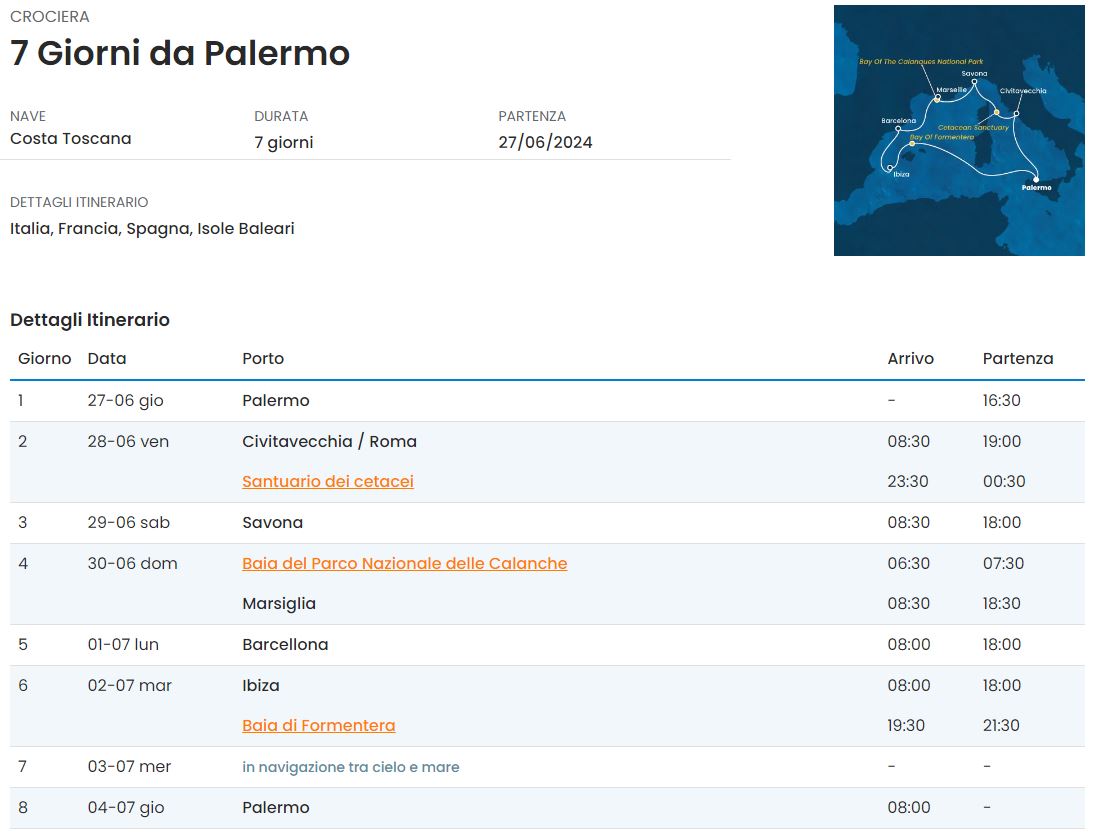 COSTA TOSCANA PARTENZA DEL 27 GIUGNO 2024: prenota la tua crociera tra le più belle mete del Mediterraneo. Una meravigliosa vacanza che ti permetterà di rilassarti e di lasciarti sorprendere da tutti i servizi che questa nave ha da offrirti!