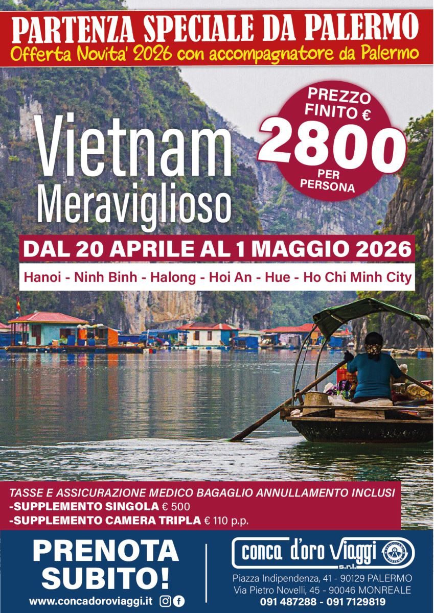 SPECIALE VIETNAM 2026 DAL 20 APRILE AL 1 MAGGIO 2026 PARTENZA SPECIALE CON ACCOMPAGNATORE DA PALERMO